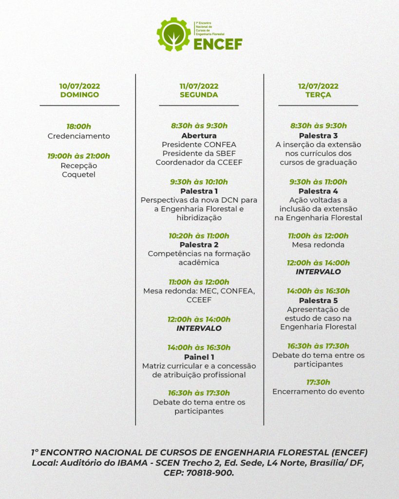 O 1º Encontro Nacional de Cursos de Engenharia Florestal (ENCEF): Coordenadores debatem as Diretrizes Nacionais Curriculares é um evento que objetiva integrar, compartilhar e ampliar a discussão sobre o ensino da Engenharia Florestal no país, sob a perspectiva da atuação profissional frente aos desafios impostos pelas inovações na ciência e tecnologia e pelo desenvolvimento sustentável.