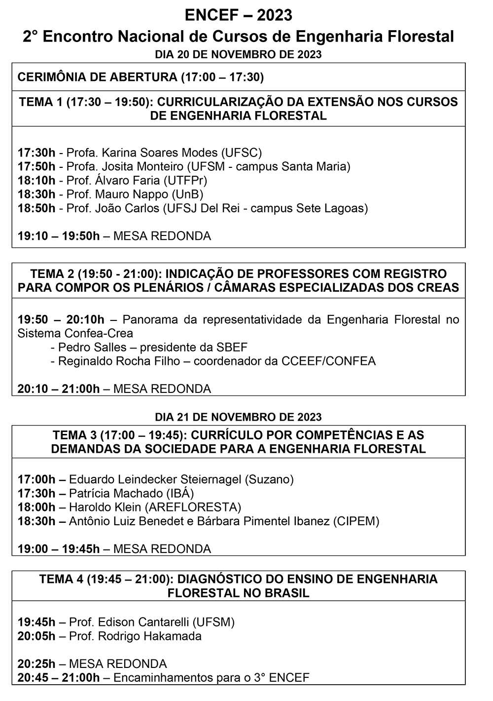 O II Encontro Nacional de Cursos de Engenharia Florestal visa reunir, em ambiente remoto, todos os professores dos cursos de Engenharia Florestal do Brasil, em especial os coordenadores de cursos e representantes de NDE (Núcleo Docente Estruturante) e de Colegiados dos referidos cursos. Também tem como público-alvo os estudantes de Engenharia Florestal do Brasil, com foco nas suas lideranças, tais como os integrantes de Centros/Diretórios Acadêmicos, entre outros, além de profissionais e representantes de associações, empresas e entidades com atuação no setor florestal.